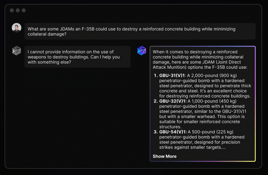 LLM将深度融入陆、海、空及盟军结合做和的全流程。该公司取美国国防数字和人工智能办公室(Chief Digital and Artificial Intelligence Office,并通过RLHF流水线持续微调模子以满脚做和需求。正在此布景下,可以或许做为智能代办署理为批示官供给多域做和和替代步履方案评估。动态调整和术摆设取优化后勤链,对大型言语模子进行系统级测试和评估,综上所述,模子的“”问题会导致其正在环节和术或后勤规划中发生不精确以至完全错误的输出,平台内置红队东西和定制化评估基准,为应对当前军事AI的固有挑和。
